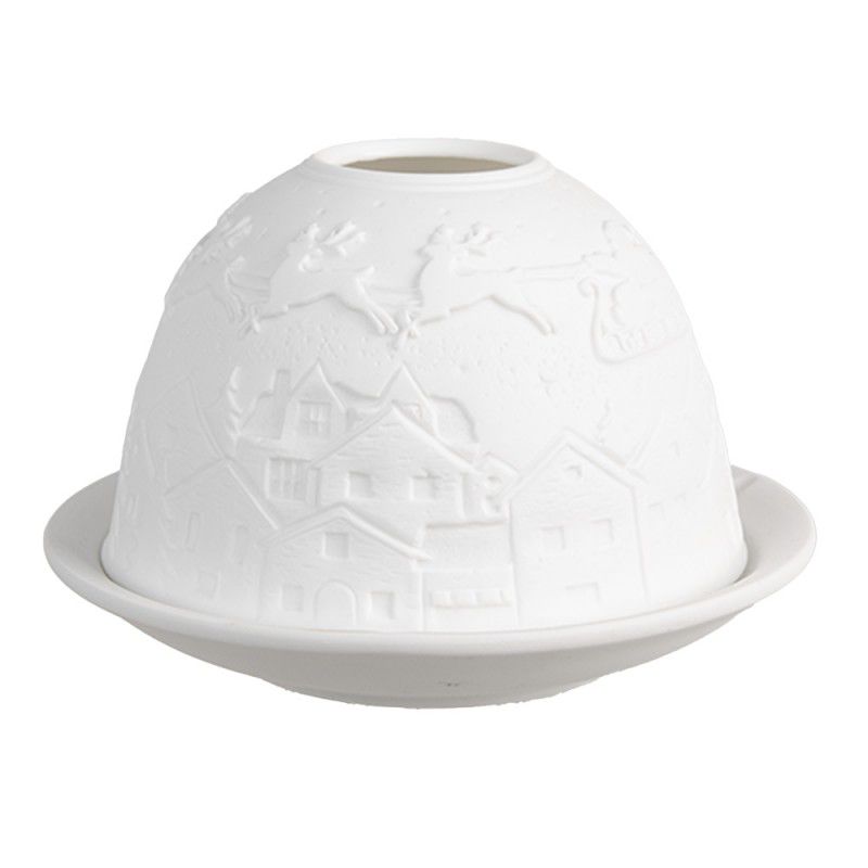 O porta-vela Trenó e Renas é confeccionado em porcelana branca translúcida, com detalhes em relevo que retratam Papai Noel voando em seu trenó sobre uma charmosa vila coberta de neve.