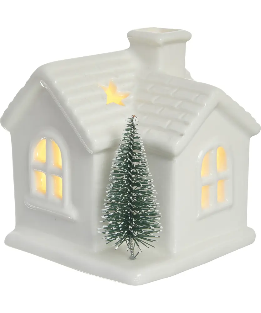 Crie um clima natalino mágico com esta Casa de Natal, feita em porcelana delicada e acompanhada de uma mini árvore artificial.