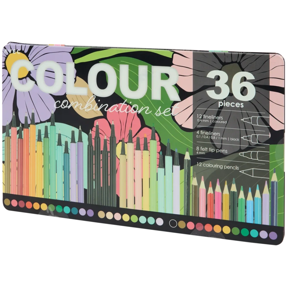 O kit inclui 12 fineliners coloridos de 0,4 mm, perfeitos para detalhes, contornos e ilustrações precisas. Conta ainda com 4 fineliners pretos com diferentes espessuras (0,1 mm, 0,4 mm, 0,8 mm e 1 mm), ideais para escrita técnica, lettering e desenho profissional. Para traços mais largos e preenchimentos, o conjunto inclui 8 marcadores de ponta feltro de 4 mm, além de 12 lápis de cor, que permitem sombrear, misturar cores e criar efeitos variados.