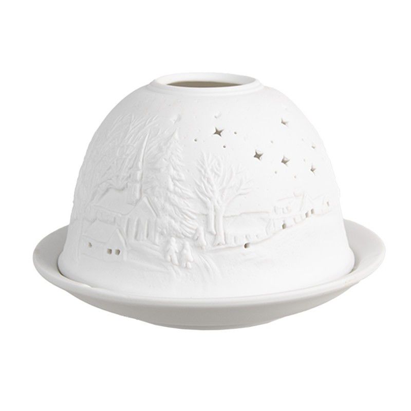 O porta-vela Vilarejo de Inverno retrata em porcelana o charme de uma vila coberta de neve, sob um céu estrelado.