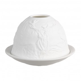 Um elegante suporte para vela do tipo tealight (vela de chá), confeccionado em porcelana branca de alta qualidade, com um delicado design de cervo que adiciona charme e aconchego à decoração.