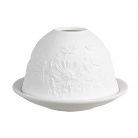 O suporte para vela tipo tealight, é uma peça decorativa refinada, feita em porcelana branca de alta qualidade, com delicado motivo de flores que adiciona elegância e suavidade ao ambiente.