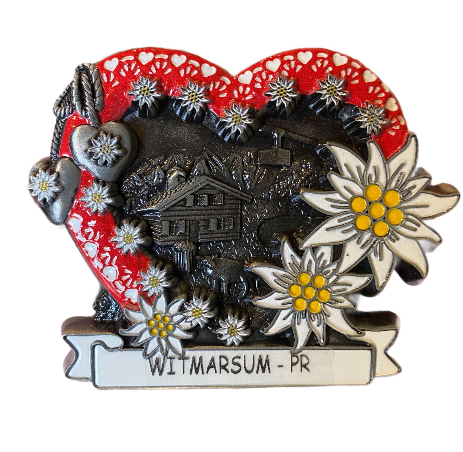 Imã em formato de coração com detalhes florais inspirados na arte tirolesa. Traz a inscrição "Witmarsum - PR" e destaca flores edelweiss, típicas da região alpina, remetendo as tradições germanicas preservadas no Brasil. Uma peça charmosa que une cultura europeia.
