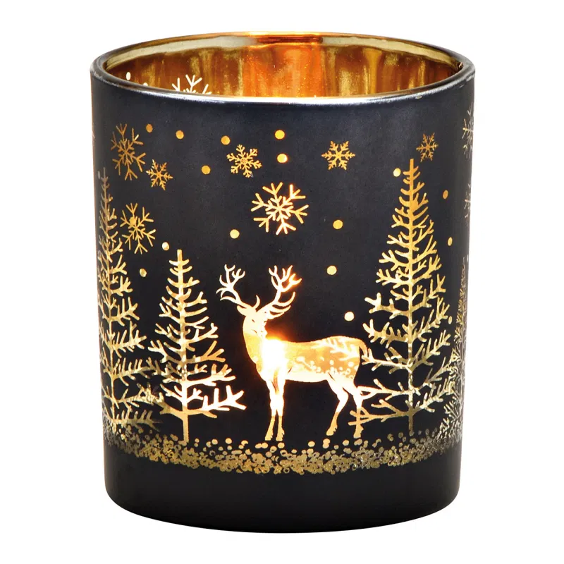 Porta-velas de Floresta de Inverno e cervos em Vidro Preto e Dourado