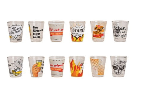 Design vibrante: Copo de shot em vidro colorido com frases (trinksprüche).
