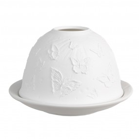 Produzido com porcelana de alta qualidade, apresenta um acabamento fino e elegante, perfeito para iluminar ambientes com charme e sofisticação. A luz da vela acesa se reflete pelas aberturas do desenho das borboletas, criando um efeito luminoso encantador que transforma o espaço.