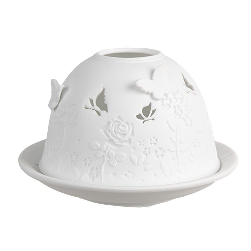 Feito em porcelana branca translúcida de alta qualidade, esse modelo apresenta delicados relevos florais e recortes de borboletas em diferentes tamanhos, criando um espetáculo de luz e sombra quando a vela é acesa.
